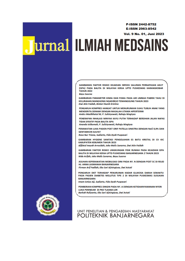 The incidence of perineal injuries from WHO (World Health Organization) data in mothers giving birth in the world there are 2.7 million cases, where this figure is expected to reach 6.3 million in 2050. The results of a preliminary study conducted on October 28, 2022, at the Health Center Karangreja obtained data from 234 mothers giving birth, and from January to September 2022, it was found that 47 of them came from the village of Tlahab Lor. Cold compresses, or cold therapy, are a physical therapy modality that uses the physical properties of cold to treat various conditions, including perineal wound pain. To determine the effectiveness of giving cold compresses to postpartum mothers with perineal wound discomfort. This study used a case study method with respondents giving birth to perineal wounds on day 2. Using three instruments, namely observation sheets, interview sheets, and the Gordon assessment format, This research was conducted in Tlahab Lor Village for 3 days, from April 30 to May 2, 2023. After 3 days of action, the perineal wound pain was reduced. The pain scale before the cold compress was 6, but after being given a cold compress, it was 2. Applying cold compresses to mothers with perineal wounds is effective in reducing pain and discomfort.